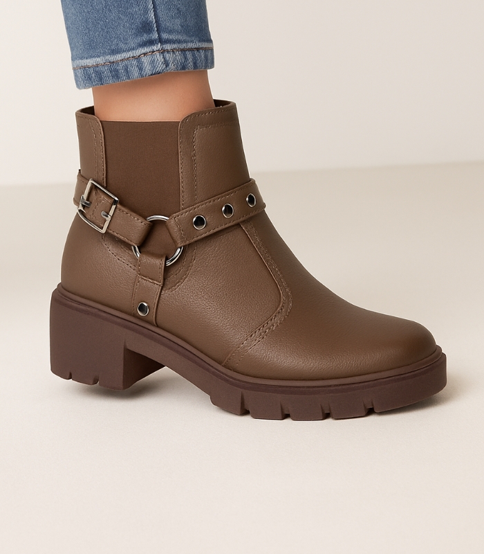 Bota coturno com fivela, salto médio e solado tratorado. Estilo, conforto e presença em um só calçado.